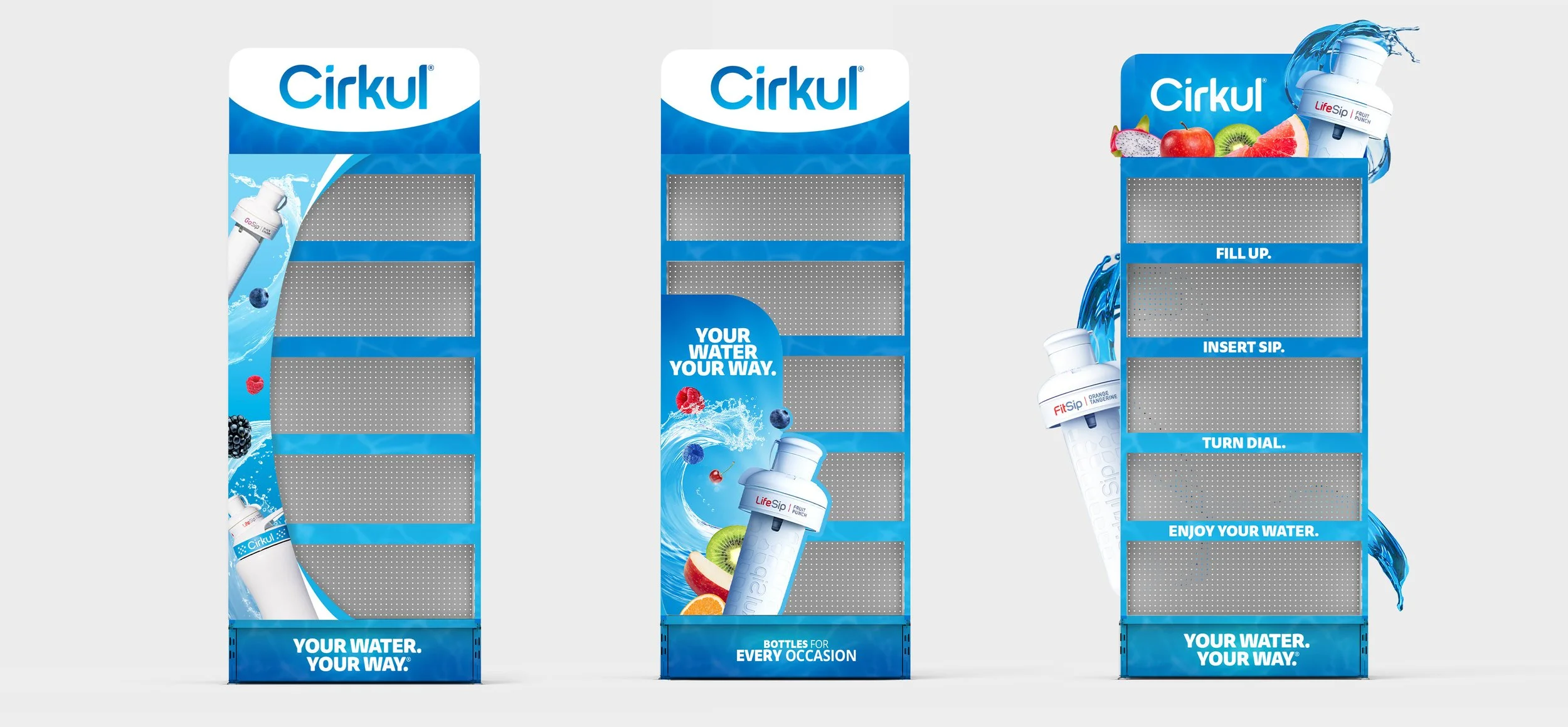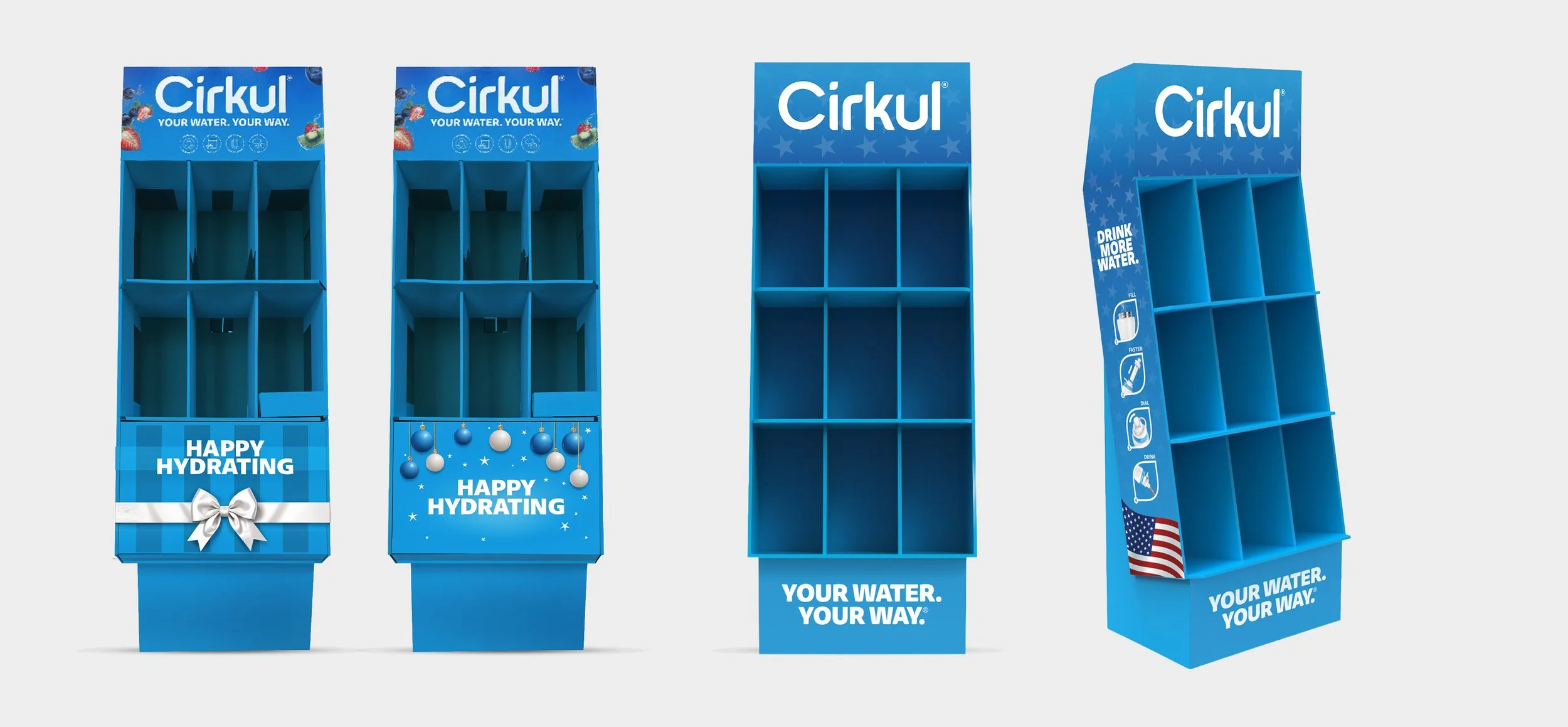 A variety of POS materials created for retailers like Target and Walmart, designed to introduce Cirkul to new customers. These displays are both educational and visually engaging to capture attention and encourage exploration.
