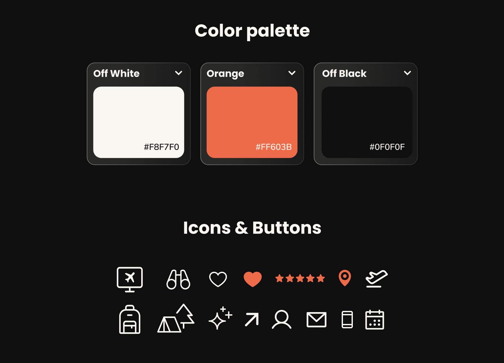 BRANDINGThe overall system was designed to feel modern, approachable, and optimized for both exploration and planning, ensuring the experience feels inspiring without sacrificing ease of navigation. Orange was chosen as the accent color to highlight key details and calls to action. A clean, outlined icon library reinforces simplicity and consistency, while typography, spacing, and layout decisions were carefully crafted to guide users naturally through the content.