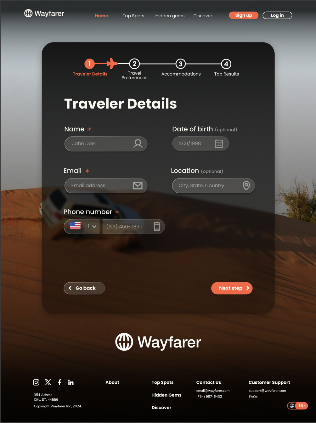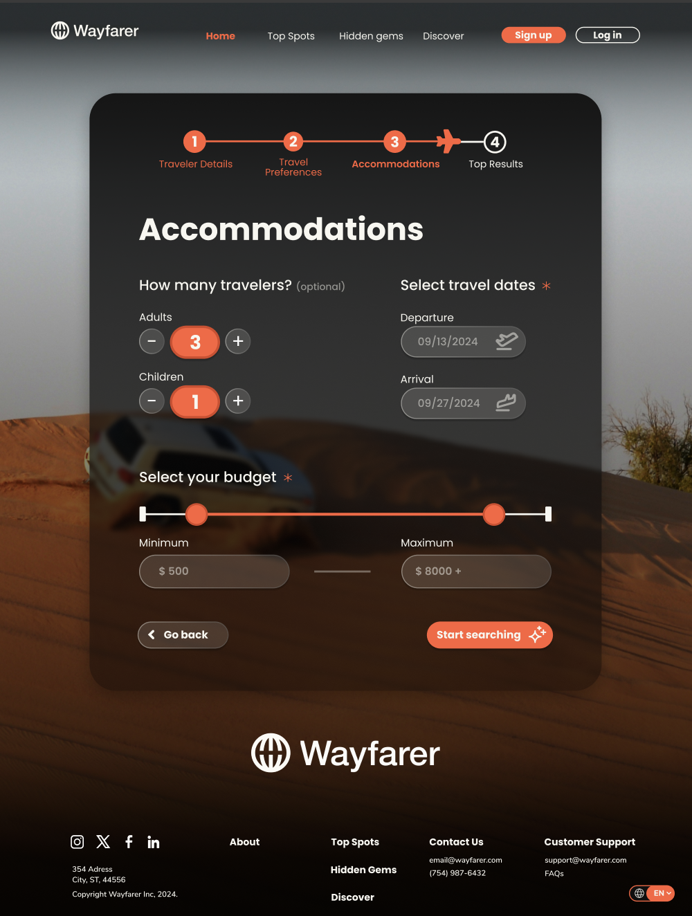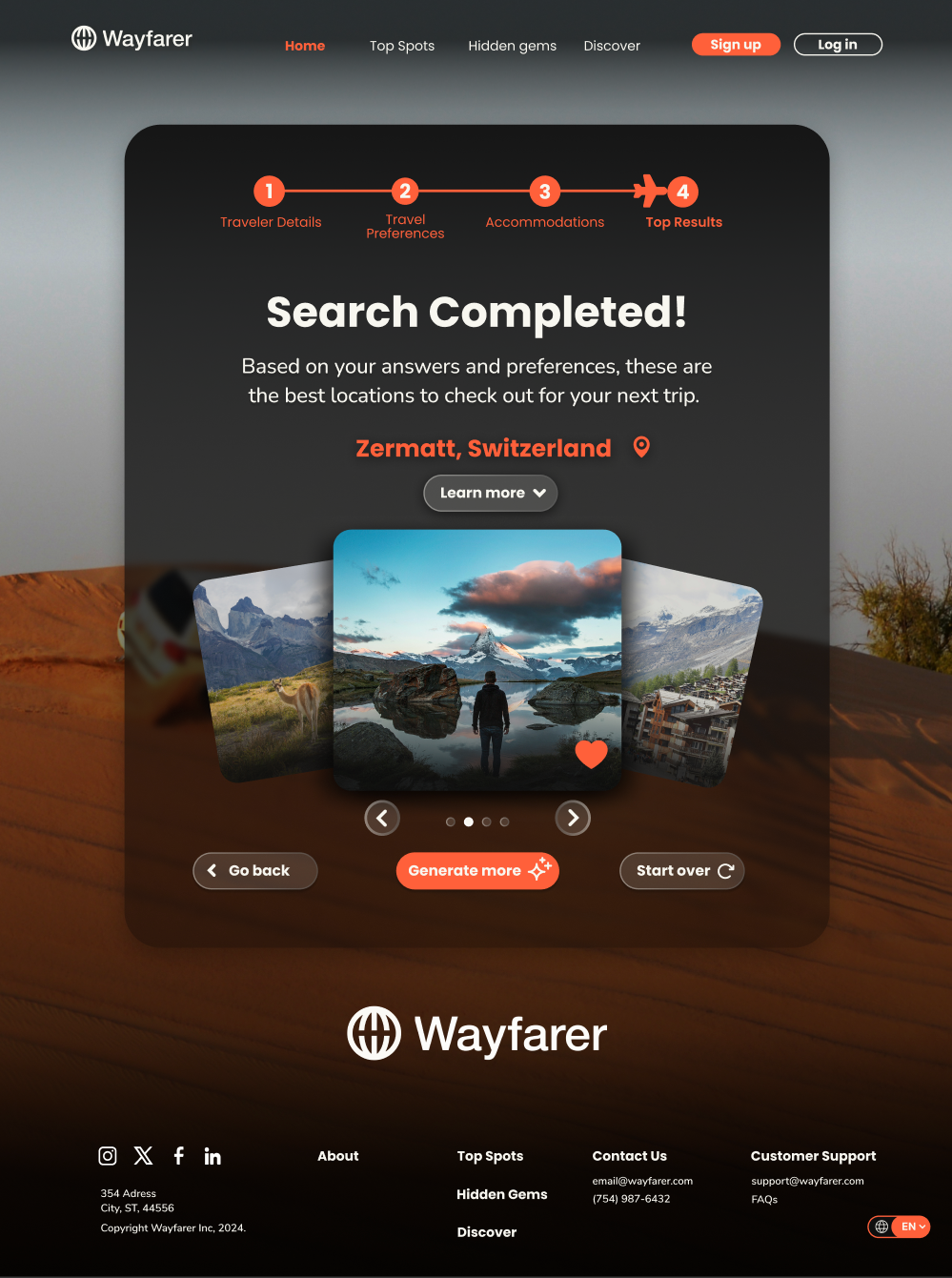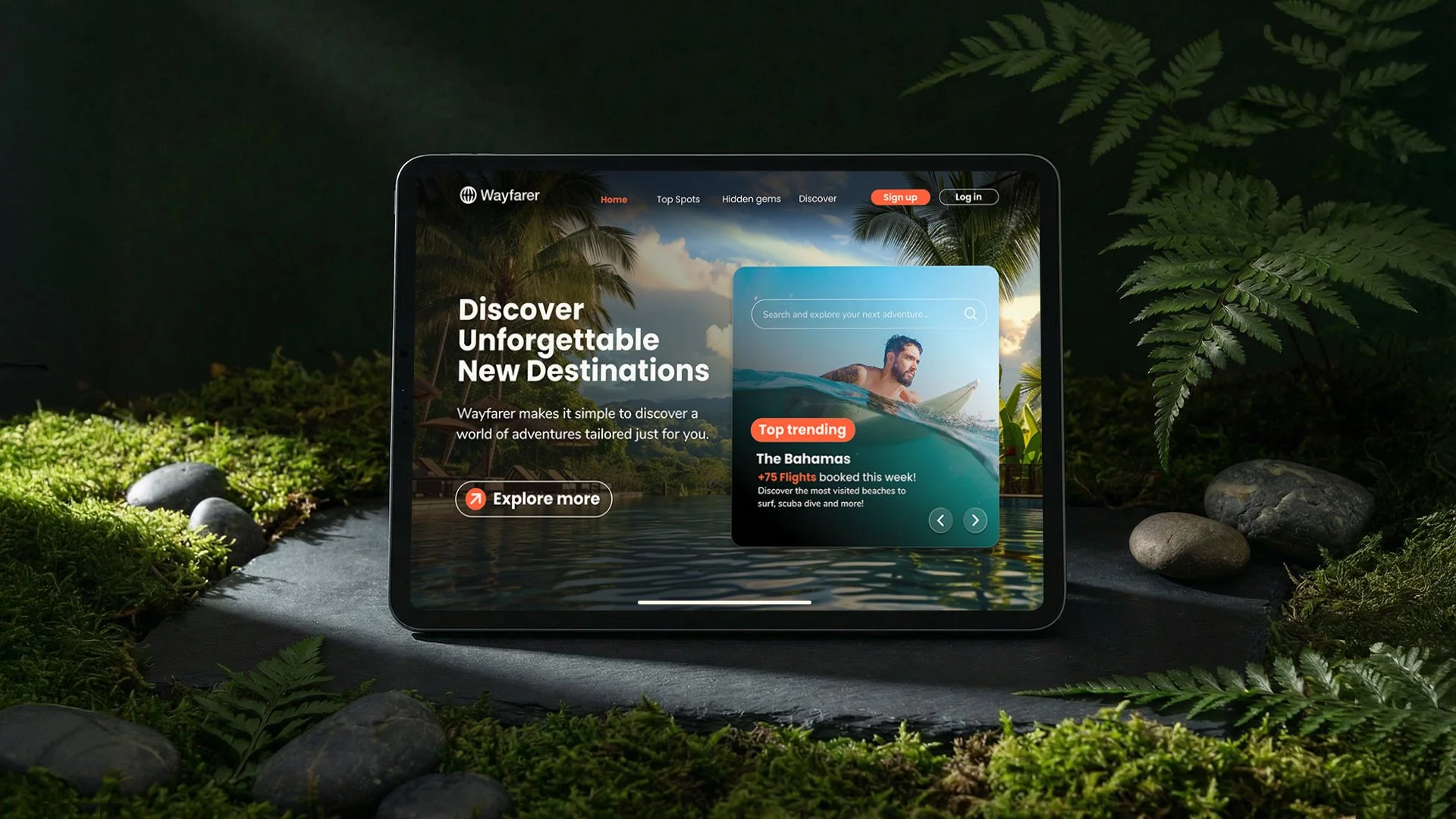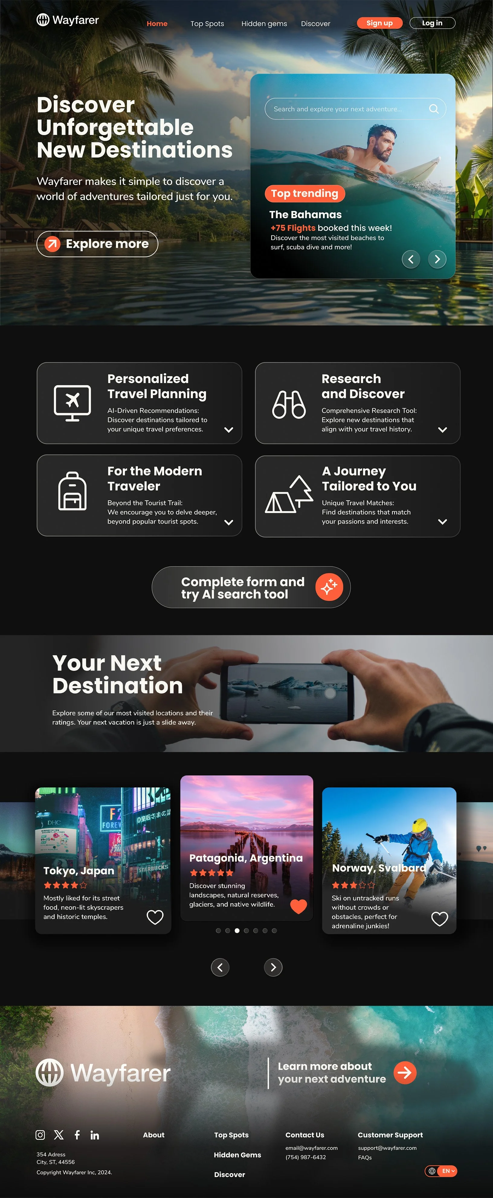 Wayfarer is a conceptual travel agency website designed as part of a DesignLab course project. Using the provided logo as a starting point, I spent several weeks designing the experience from the ground up. My role included creating UI drafts from scratch, curating and exploring imagery, and researching trending styles and best practices in travel and booking platforms at the time. The final result is a complete end-to-end website experience that reflects how a modern travel booking platform could look and function.